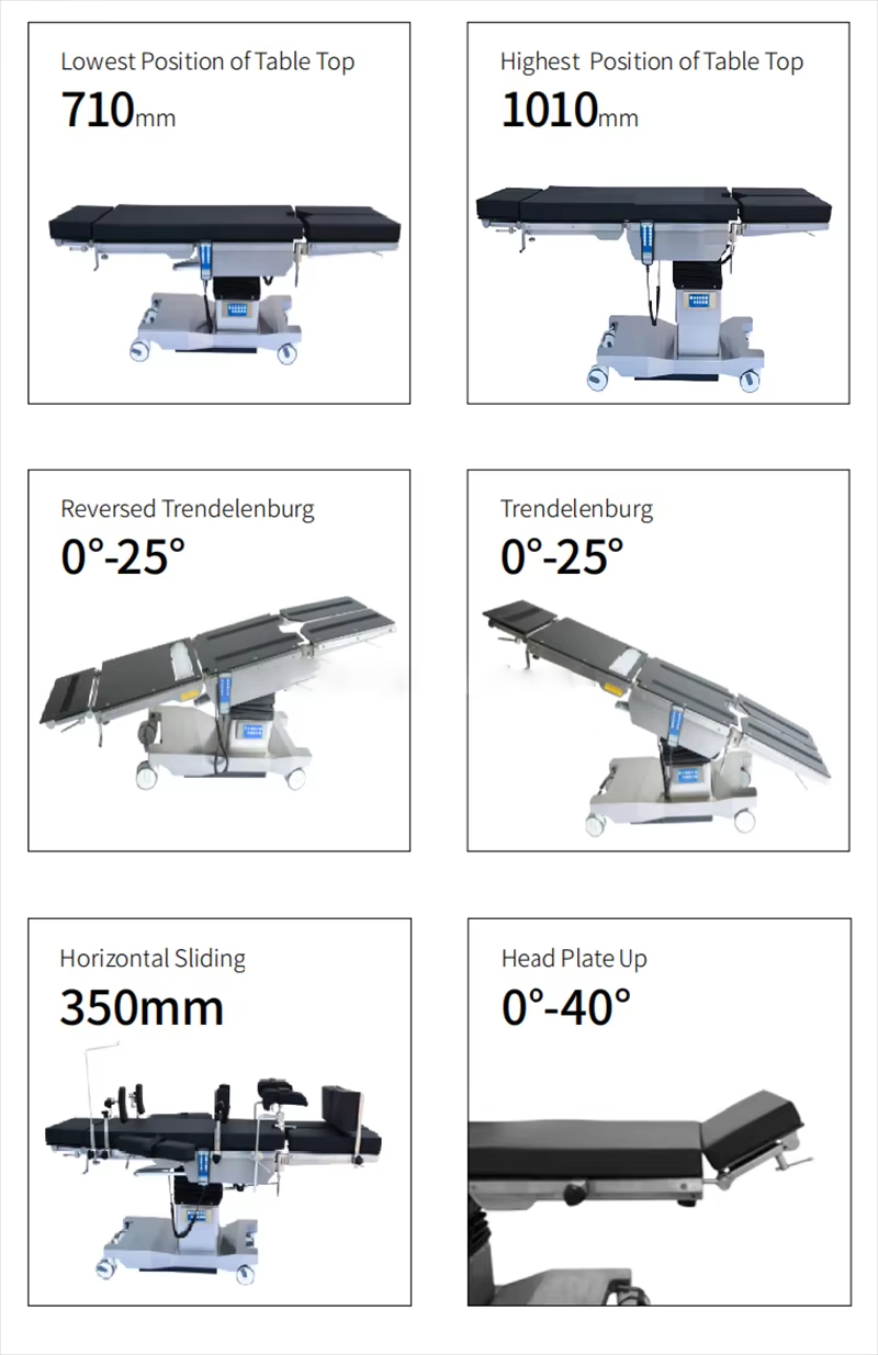 تنقسم الطاولة إلى أربعة أقسام: الرأس والظهر (بما في ذلك جسر الخصر) والورك والساق. سطح الطاولة مصنوع من مادة مركبة عالية القوة مع نقل الأشعة السينية. يمكن التعاون مع ذراع C لالتقاط الصور.