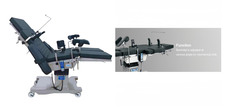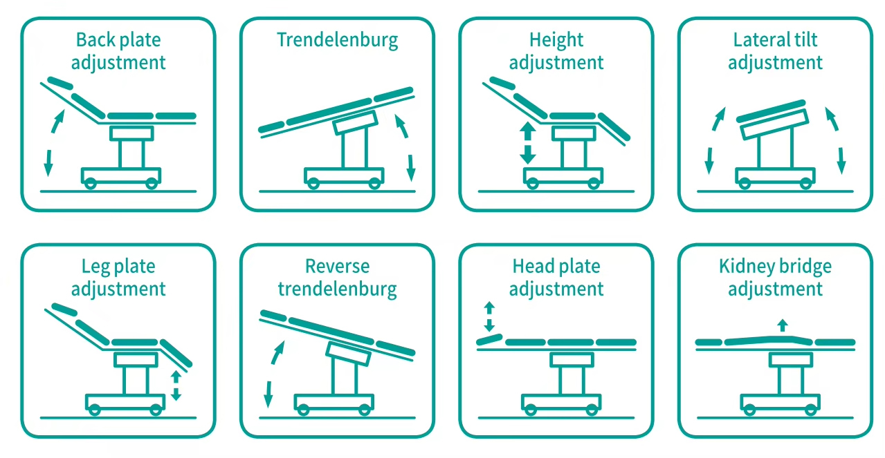 يتم التحكم في رفع الطاولة، والإمالة إلى الخلف والأمام، والإمالة إلى اليسار واليمين، والطي لأعلى ولأسفل للوحة الخلفية، والترجمة بواسطة قضيب الدفع الكهربائي.