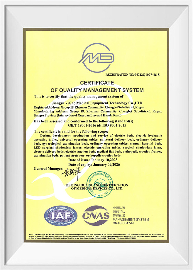 كمؤسسة مرت آيزو 9001، آيزو 13485، آيزو 14001، آيزو 45001 ، وشهادات نظام الإدارة الأخرى، تعتبر شركة شركة جيانغسو ييغاو لتكنولوجيا المعدات الطبية المحدودة جودة المنتج بمثابة شريان الحياة لها. تتوافق جداول التشغيل لدينا بشكل صارم مع معايير CE مما يعني أنها لا تلبي متطلبات السلامة والصحة والبيئة للسوق الأوروبية فحسب، بل تمثل أيضًا المستوى الرائد عالميًا في تصميم المنتجات وتصنيعها.